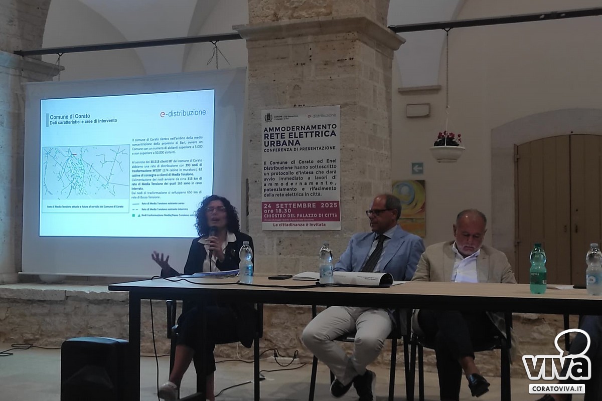 È stato presentato ieri 24 settembre, nel chiostro del Palazzo di Città, un protocollo d'intesa tra il Comune di Corato ed Enel, al fine di potenziare il sistema elettrico cittadino.