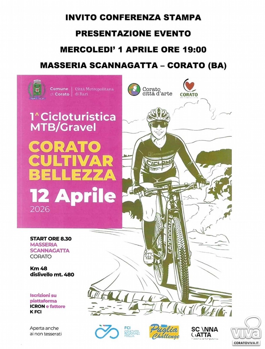 Un nuovo appuntamento dedicato allo sport, al territorio e alla valorizzazione paesaggistica sarà presentato ufficialmente a Corato. Mercoledì 1 aprile, alle ore 19:00, la suggestiva cornice della Masseria Scannagatta ospiterà la conferenza stampa di lancio della prima cicloturistica MTB/Gravel "Corato Cultivar Bellezza", in programma il 12 aprile 2026.
