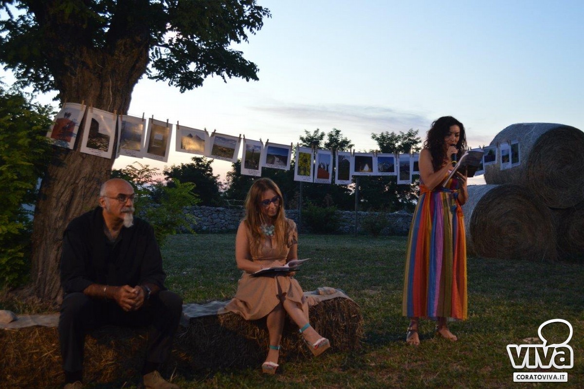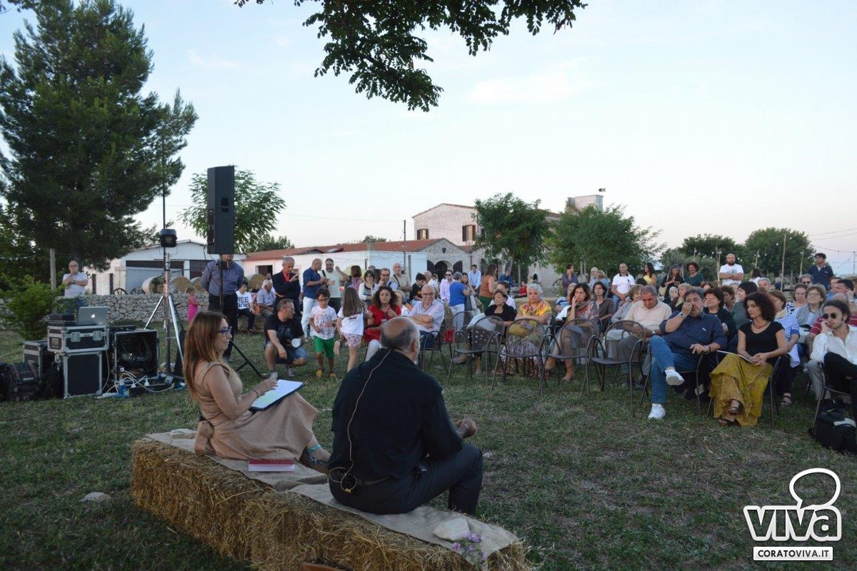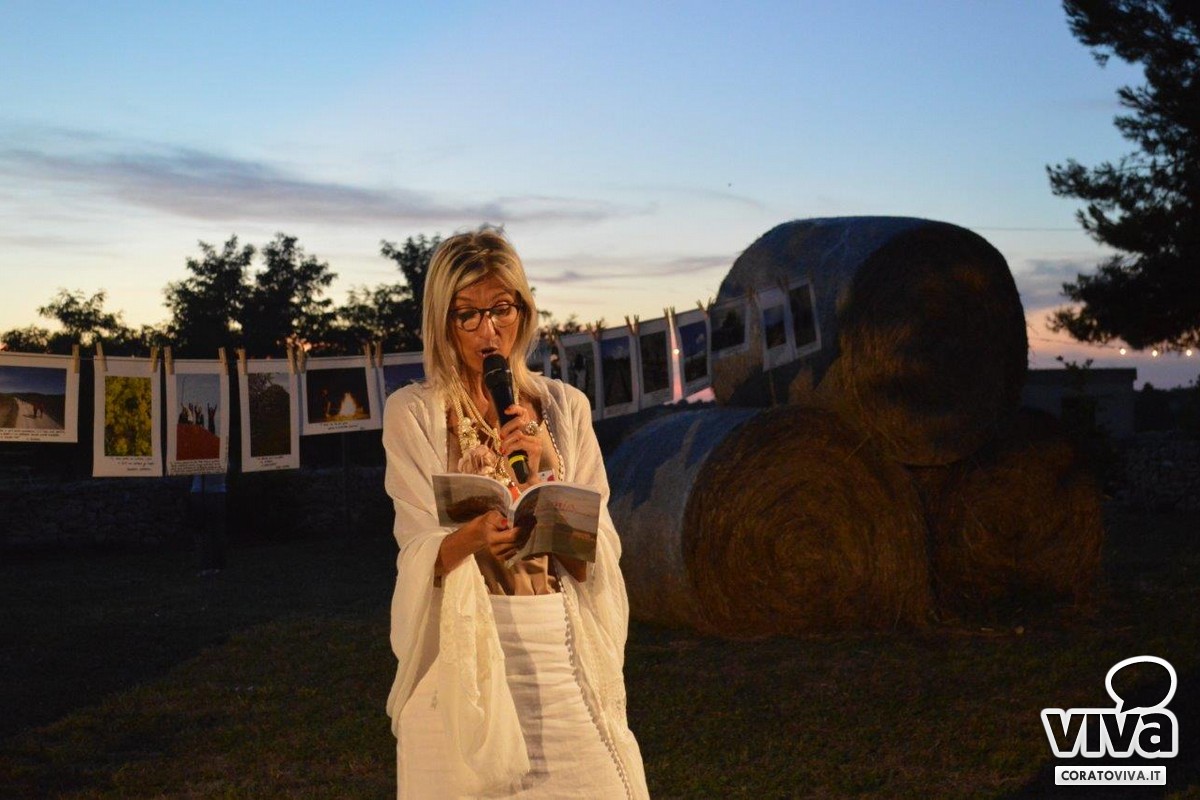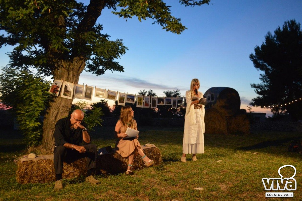 Al momento spensierato e divertente, è seguito quello della commozione e del ricordo di Angela Pisicchio, scomparsa prematuramente meno di un mese fa che, nell'ambito di Art_Estate ha curato in ogni minimo dettaglio lo spazio del Presidio del Libro di Corato. Idea di Angela Pisicchio, in particolare, la figura del "Donatore di voce", una persona preposta alla lettura ad alta voce di brani e poesie. Proprio due donatrici di voce d'eccezione, l'attrice Claudia Lerro e la Prof. Monica Tommasicchio hanno letto alcuni passi tratti da "Facce da Murgia", scritto da Corrado Palumbo. L'autore, esperto e rinomato escursionista, in una piacevole chiacchierata con la moderatrice Mariella Sivo ha parlato del suo libro, una serie di incontri, reali e immaginari, con personaggi che amano o hanno amato la Murgia, da Ciccillo (uomo di Altamura) a Federico II.