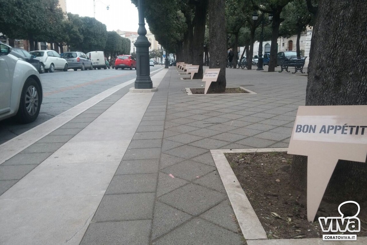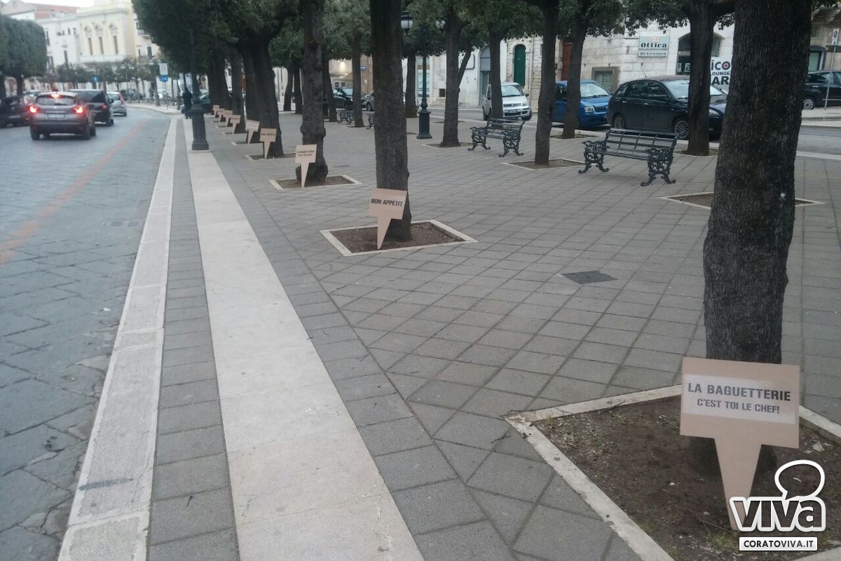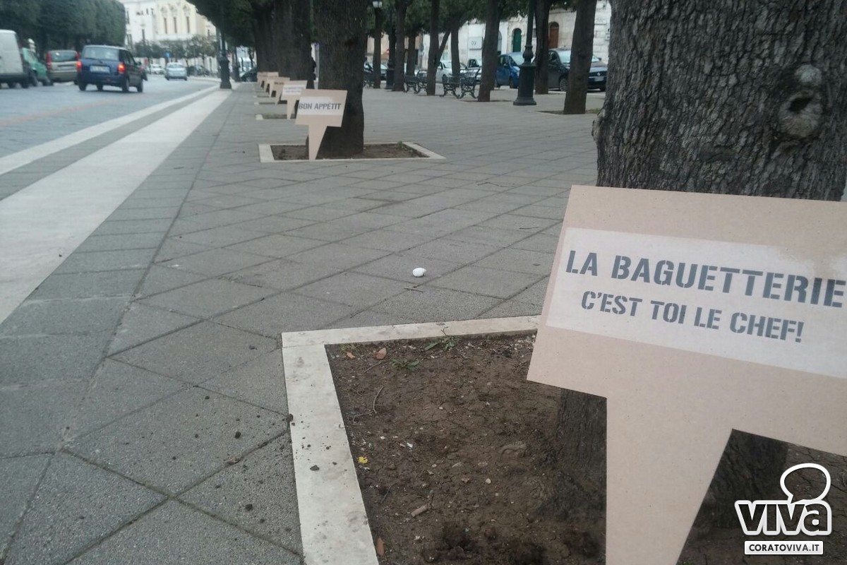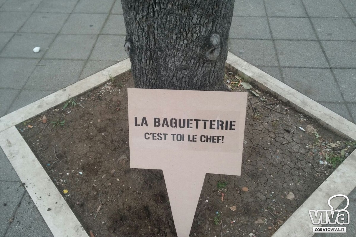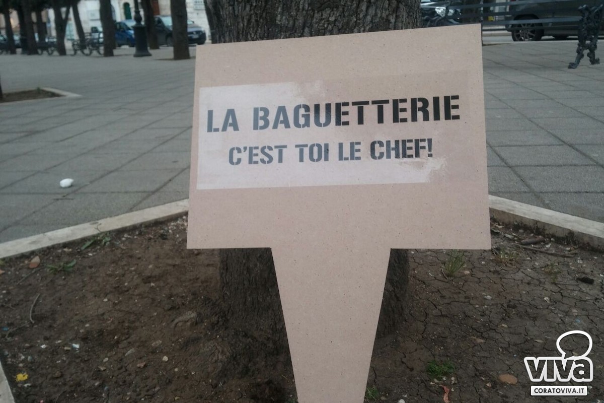 Lo staff della Baguetterie coratina ha piantato nelle aiuole di corso Mazzini dei cartelli dall'inequivocabile messaggio: "C'est toi le chef". Si, proprio così: saranno infatti i clienti e gli appassionati a scegliere gli ingredienti da gustare nelle diverse specialità di panini che offrirà il locale.