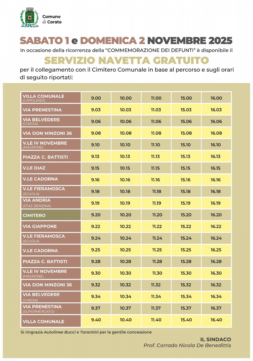 Sabato 1 e domenica 2 novembre, in occasione della ricorrenza della "Commemorazione dei defunti" è disponibile il SERVIZIO NAVETTA GRATUITO per il collegamento con il cimitero Comunale in base al percorso e sugli orari riportati dal manifesto in foto.