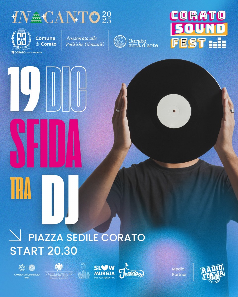 Venerdì 19 dicembre in Piazza Sedile a Corato, a partire dalle 20.30, arriva la Sfida tra DJ del Corato Sound Fest. Un momento dedicato a chi ama scoprire nuove sonorità e nuovi volti della scena musicale. Sul palco saliranno i DJ selezionati dalla giuria tra tutti coloro che hanno presentato la propria candidatura al Corato Sound Fest: una selezione che racconta ricerca, stile e identità diverse, da vivere sotto le luci di Incanto 2025.