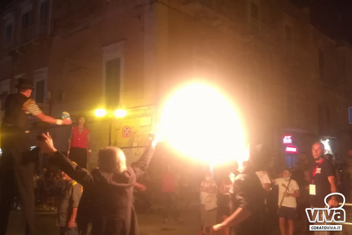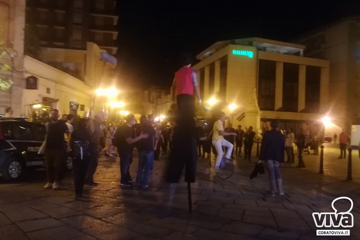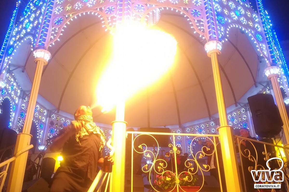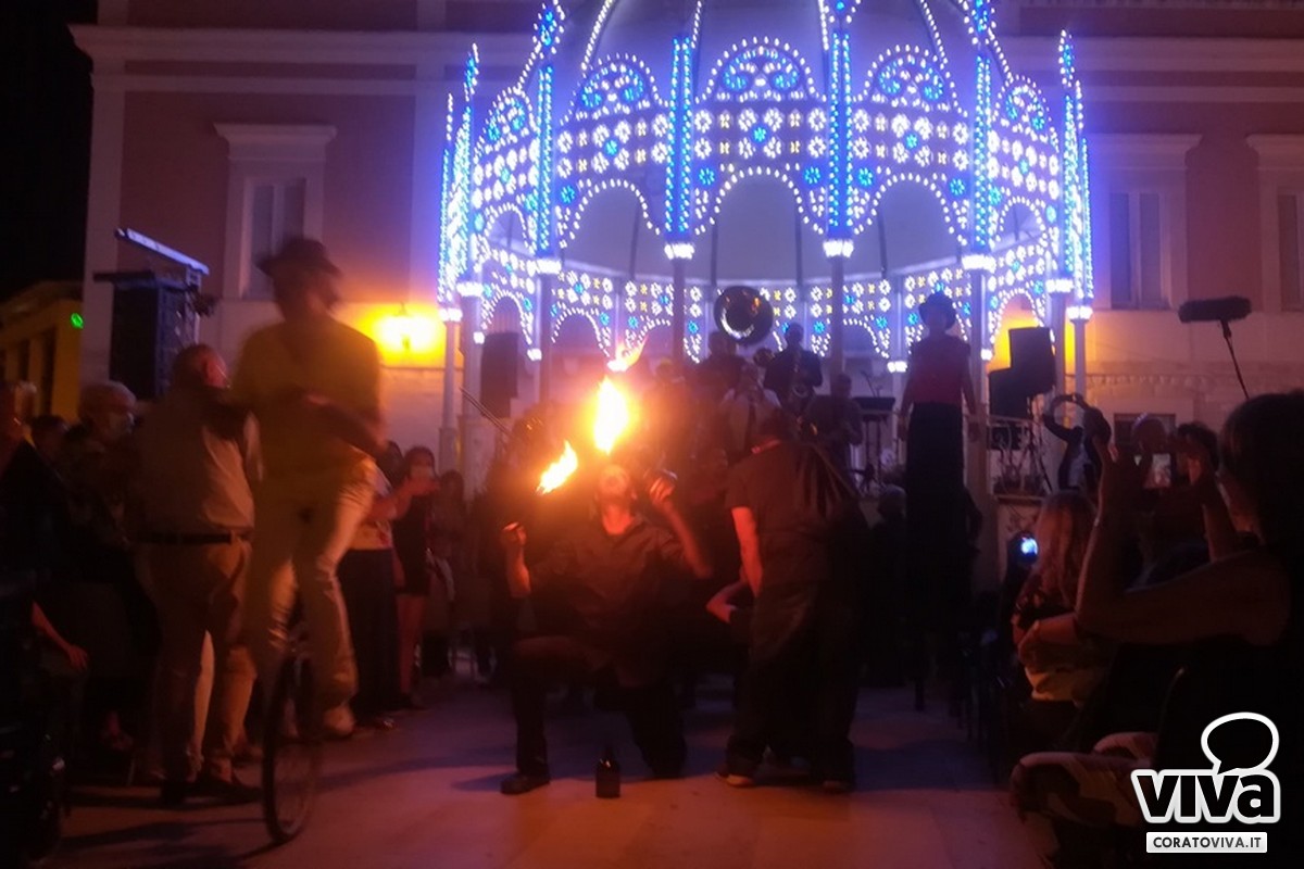 Dal suo ingresso sulla scena della piazza e per tutto il corso dell'esibizione, il mondo dell'artista salentino Cesare Dell'Anna è fatto di colore, fratellanza e di arte a 360°. Giocolieri, trampolieri, artisti di strada, sputa fuoco hanno contribuito a creare una atmosfera festosa e un vero e proprio inno all'arte in ogni sua forma d'espressione.