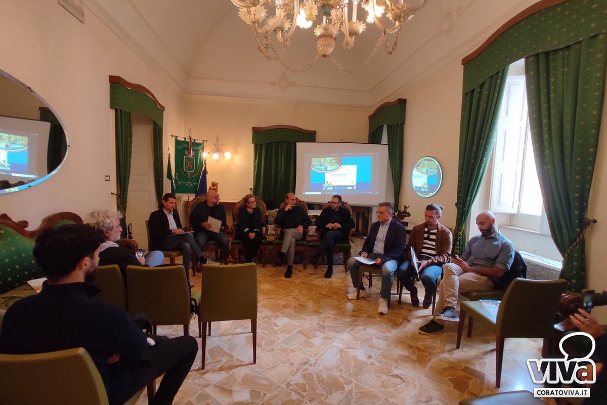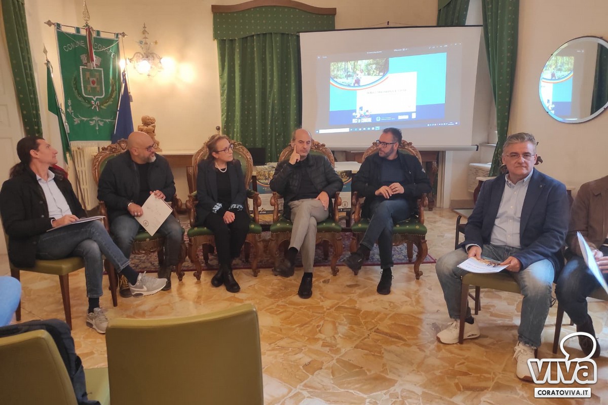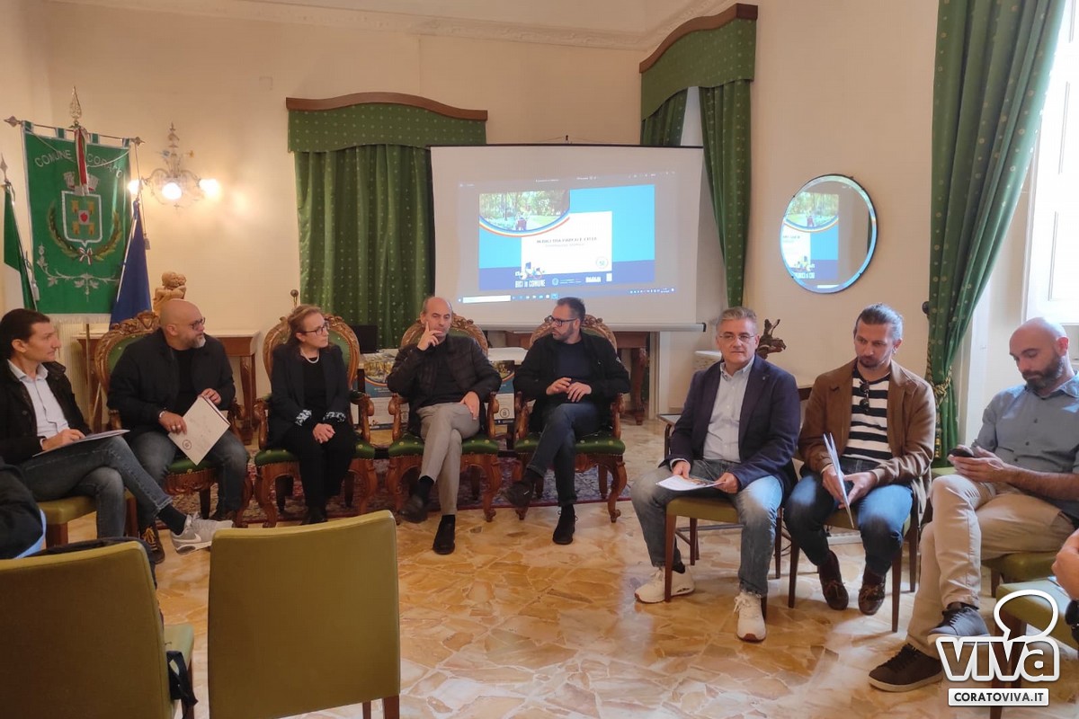 La presentazione ufficiale del progetto "In bici tra Parco e Città", promosso dal Ministero dello Sport, Sport e Salute e ANCI, è avvenuta questa mattina, presso la sala verde del Palazzo di Città di Corato. Presenti il Sindaco De Benedittis, l'assessore Antonella Varesano di Corato, l'assessore all'ambiente e al territorio del Comune di Ruvo Antonio Mazzone, il coordinatore regionale di Sport e Salute Luca Belasco e i rappresentanti dei partner del progetto: Mimmo Lorusso per "VivArch", Mauro Quarto per "Visit Messapia", Giuseppe Nocella per "Murgia a Pedali" e Nico Capogna per "Pin Bike".