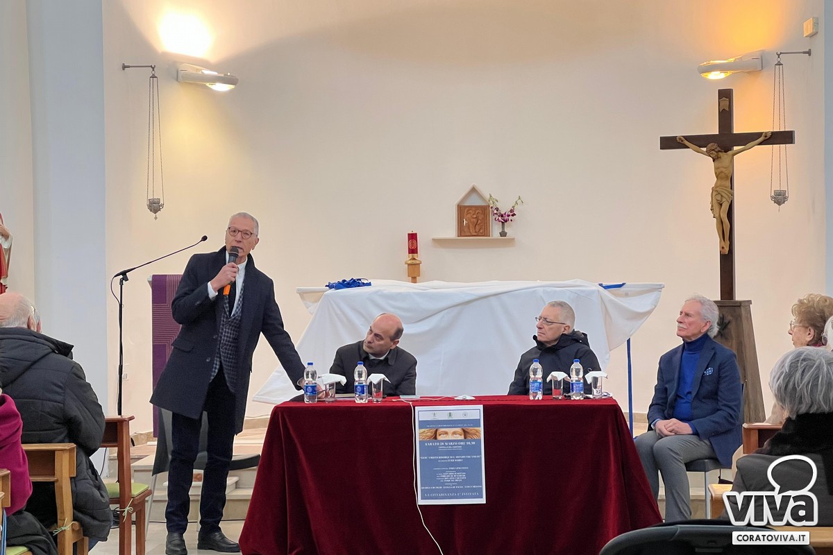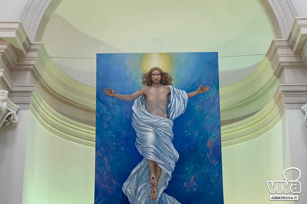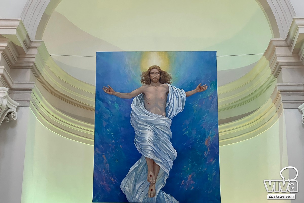 Lo svelamento dell'opera è avvenuto oggi 28 marzo, nella Cappella del Cimitero, alla presenza di S. E. Mons. Leonardo D'Ascenzo, Arcivescovo di Trani – Barletta – Bisceglie, del Sindaco di Corato, Prof. Corrado De Benedittis, da don Gino Tarantini, Cappellano del Cimitero e dal Prof. Pasquale Pisani.
