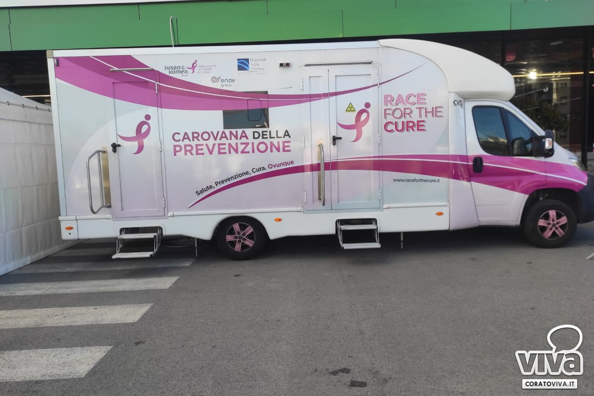 Partita oggi da Corato, l'iniziativa è stata allestita presso il parcheggio esterno dell'Interspar. L'obiettivo principale è quello di offrire esami per la diagnosi precoce dei tumori del seno e di altre patologie femminili. È possibile effettuare screening gratuiti senologici, urologici ed endocrinologici all'interno di unità mobili di Komen Italia, grazie a un'equipe medica specializzata.La carovana ha in programma altre quattro tappe: domani 9 ottobre a Modugno, il 10 ottobre a Giovinazzo, a novembre, invece, a Marigliano (Campania) e Rende (Calabria).