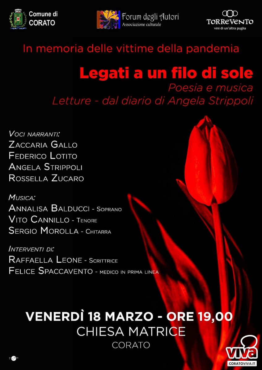 Si intitola "Legati a un filo di sole", l'evento ideato da Angela Strippoli, promosso dal Comune di Corato e il Forum degli Autori, che si terrà il 18 marzo in occasione della Giornata nazionale in memoria di tutte le vittime della pandemia da Coronavirus.