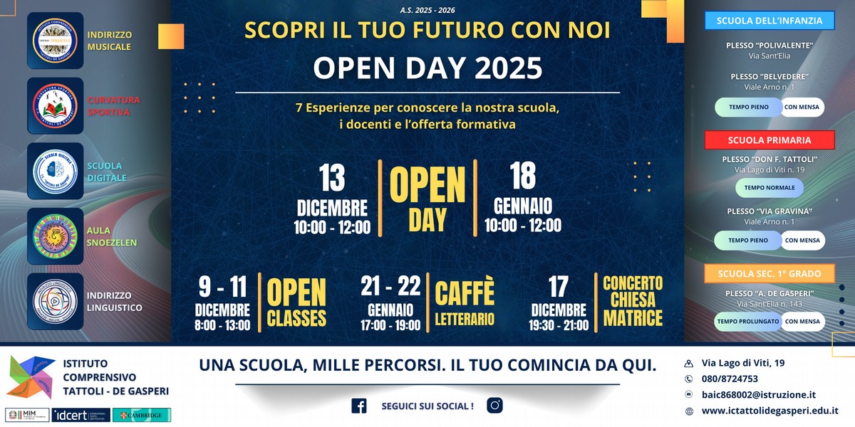 Il "Tattoli De Gasperi" è pronto per il nuovo anno scolastico 2026/27. Aperte le iscrizioni dal 13 gennaio al 14 febbraio, l'Istituto Comprensivo Tattoli De Gasperi il 18 gennaio dalle 10 alle 12 presenta il variegato piano dell'offerta formativa dell'Istituto, gli ambienti e le strumentazioni in dotazione e a disposizione dei futuri alunni.
