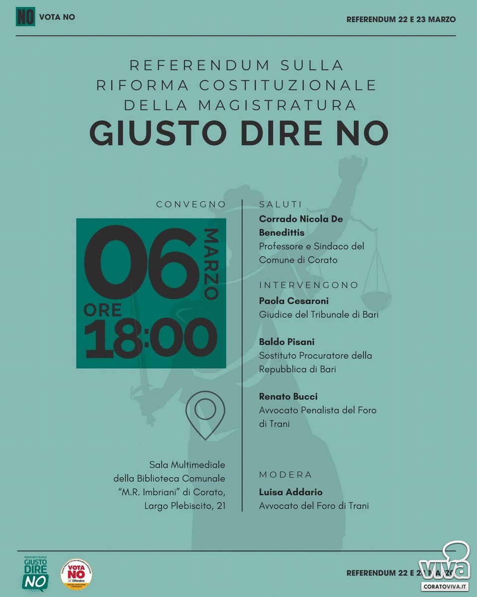 Si terrà il 6 marzo alle ore 18:00, presso la Sala Multimediale della Biblioteca Comunale "M.R. Imbriani" di Corato (Largo Plebiscito, 21), un convegno dedicato al referendum sulla riforma costituzionale della magistratura, in vista del 22 e 23 marzo.