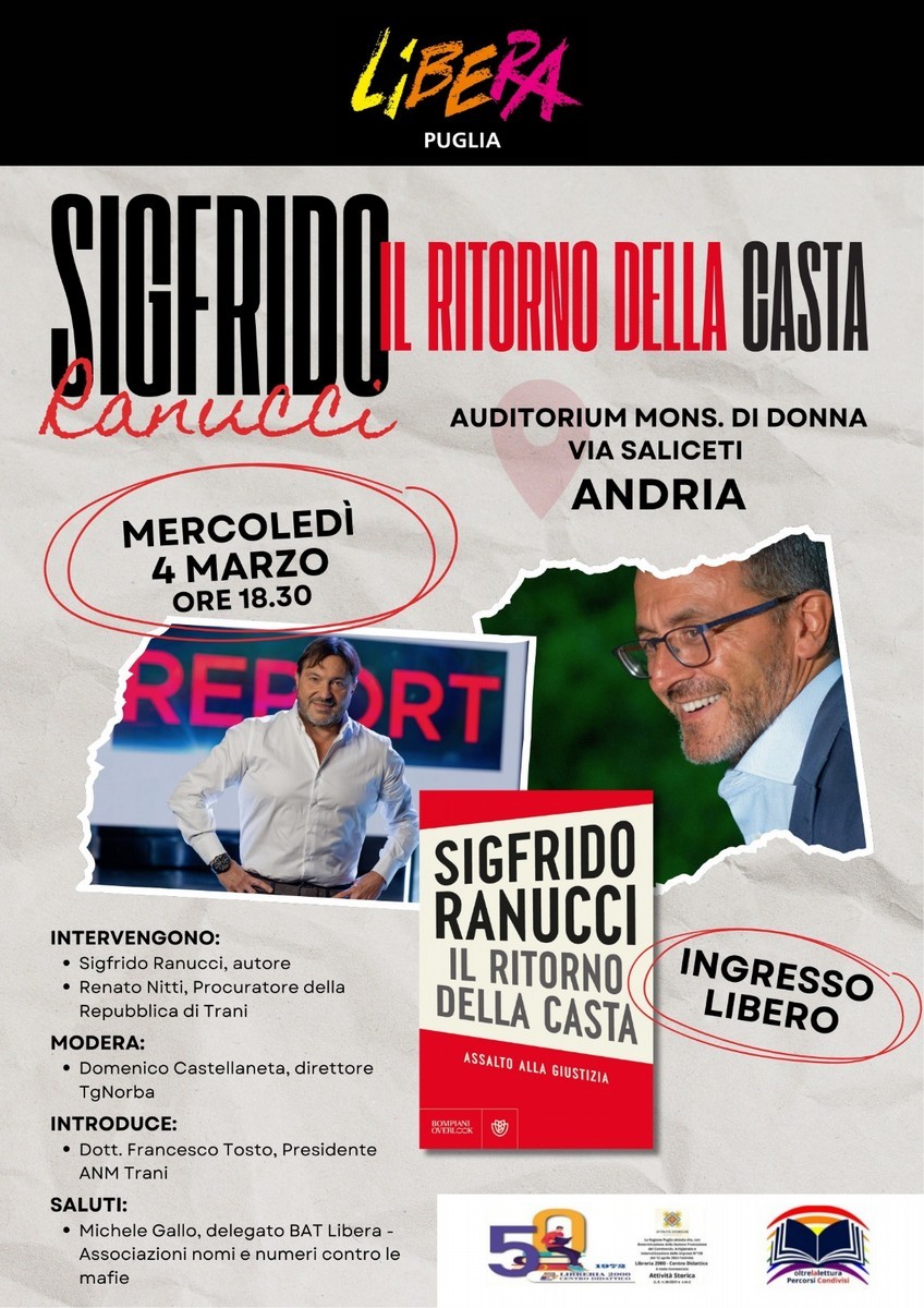 Mercoledì 4 marzo alle ore 18.30, presso l'Auditorium Mons. Di Donna in via Saliceti ad Andria, si terrà la presentazione del libro "Il ritorno della casta. Assalto alla giustizia" di Sigfrido Ranucci. L'incontro, promosso da Libera Puglia, sarà un'occasione di confronto sui temi della giustizia, della legalità e del ruolo dell'informazione. Oltre all'autore, interverrà Renato Nitti, Procuratore della Repubblica di Trani. A moderare sarà Domenico Castellaneta, direttore di TGNorba.