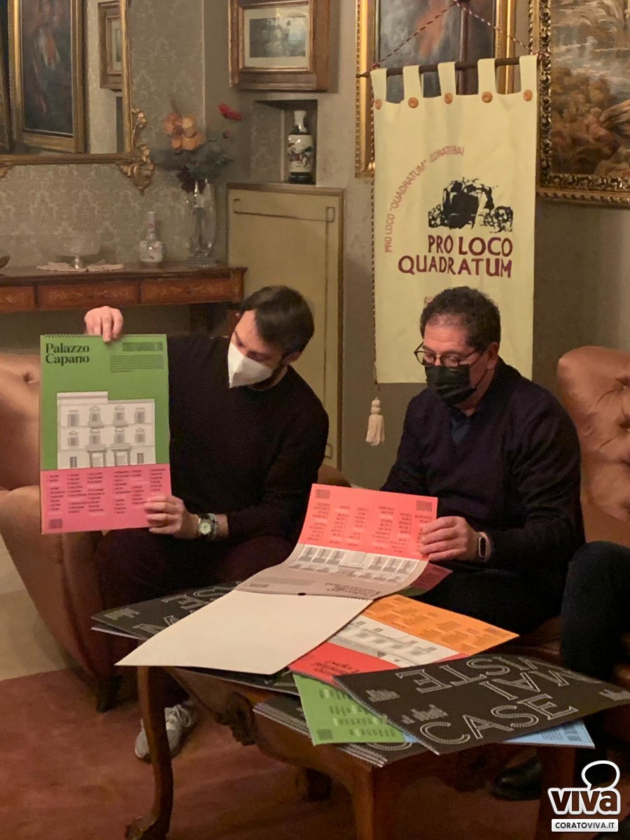 Da diciannove anni racconta la cultura e le tradizioni della nostra città e per il 2022 si propone di raccontare e riscoprire l'architettura urbana attraverso l'analisi di alcuni palazzi storici. è stato presentato ieri sera il calendario Pro Loco Quadratum, con il patrocinio del Comune di Corato, e sviluppato in collaborazione con Spore Soc. Coop.