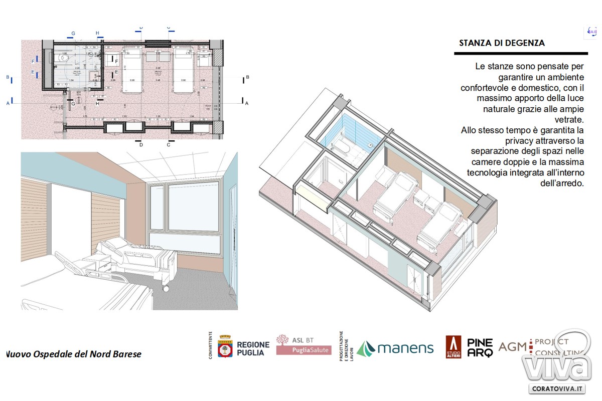 Il nuovo ospedale ospiterà 268 posti letto, di cui 25 tecnici, e beneficerà di un finanziamento totale di euro 192.500.000: sarà dotato di area medica, area chirurgica, area materno-infantile, area intensiva, area malattie infettive, pronto-soccorso, posti letto tecnici, lungodegenza e psichiatria. Ci saranno naturalmente il blocco diagnostico, il blocco operatorio, il blocco parto, blocco ambulatoriale, blocco servizi, area per il personale e area accoglienza. Il progetto, realizzato nel pieno rispetto dell'ambiente circostante è composto da un corridoio centrale e da 4 blocchi rettangolari: sono previsti 3 ingressi e percorsi di accesso organizzati per i visitatori, per i sanitari e per l'area di emergenza-urgenza. Le stanze di degenza saranno realizzate con ampie vetrate per recuperare la luce naturale, ampiamente garantita anche nell'ampia zona di ingresso."Siamo orgogliosi e soddisfatti – ha detto Tiziana Dimatteo, commissario straordinario Asl Bt – il progetto del nuovo ospedale del Nord barese è ambizioso, moderno, rispettoso delle esigenze di organizzare l'assistenza per intensità di cura. In questo momento siamo in fase di completamento delle verifiche da parte del CAB Asset sui rilievi effettuati. Entro novembre sarà consegnato il progetto definitivo per l'ammissione al finanziamento e l'avvio della gara integrata per la realizzazione del progetto definitivo e dei lavori".In base agli indirizzi programmatori il dimensionamento della struttura non è stato determinato come una semplice somma delle capacità dei reparti in chiusura o alla riproduzione dell'attuale configurazione accreditata, ma è stato basato su un'attenta analisi della popolazione target, dei suoi bisogni sanitari presenti e futuri e del contributo che il Nuovo Ospedale apporterà al rafforzamento della rete assistenziale ed al recupero di mobilità passiva. Il dimensionamento previsto per il Nuovo Ospedale, dotazioni e spazi necessari, permetterà dunque non solo di erogare l'attività presente ma di potenziarne i volumi.