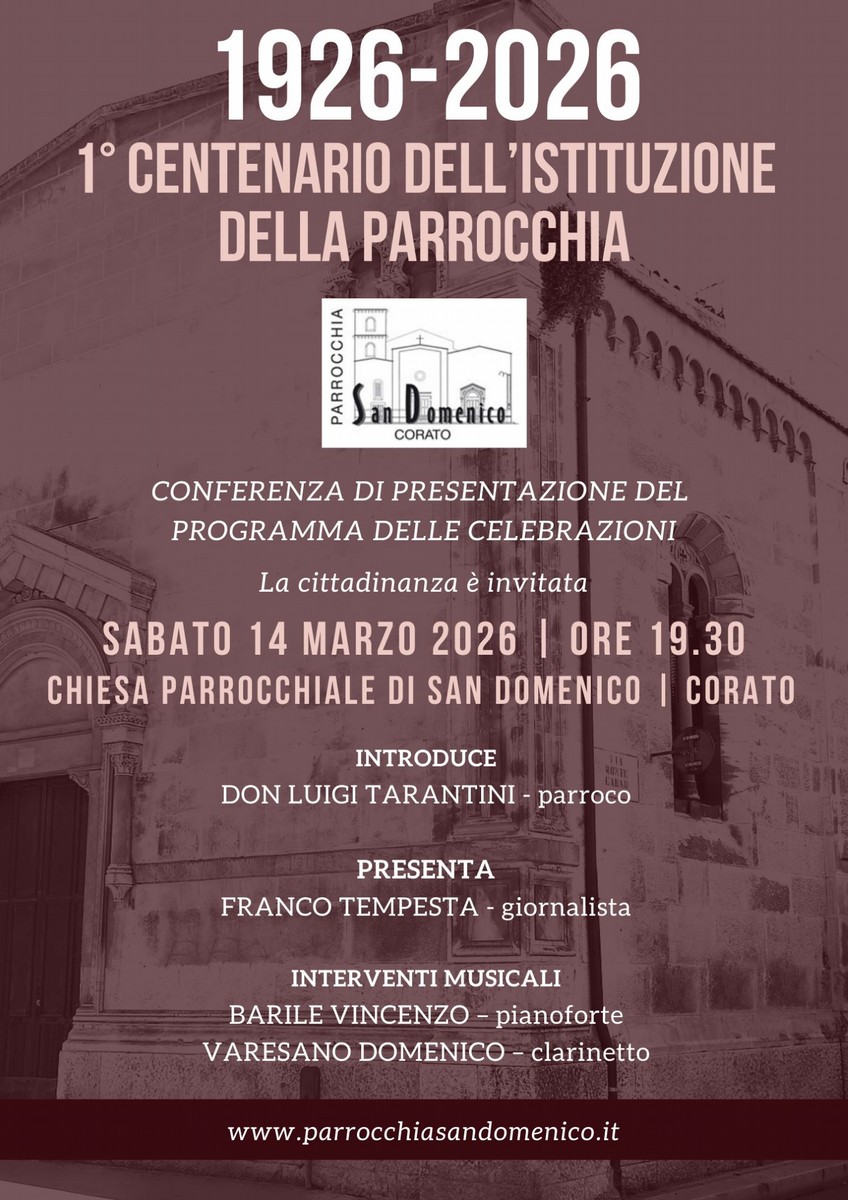 Quando una comunità parrocchiale raggiunge il suo centenario, il significato va ben oltre la cifra numerica. È il racconto dei grandi momenti della vita che si sono svolti tra quelle mura. Corato con le sue tre parrocchie (San Domenico, Santa Maria Greca e San Giuseppe) rappresenta un nodo importante del tessuto religioso della città, e questo anniversario è l'occasione per riflettere su quanto quelle comunità hanno significato per il territorio.Una serata pensata per ascoltare e riflettere