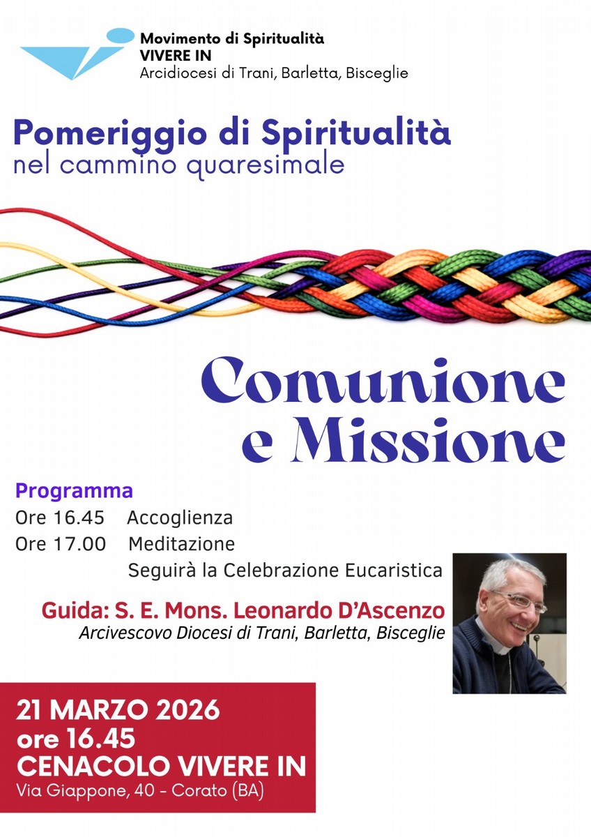 I cenacoli "Vivere In" dell'Arcidiocesi di Trani, Barletta, Bisceglie organizzano in questo tempo di Quaresima un Pomeriggio di Spiritualità aperto alla cittadinanza sul tema "Comunione e Missione". Il ritiro si terrà sabato 21 marzo 2026 dalle ore 16.45 presso il Cenacolo "Vivere In" – Via Giappone, 40 a Corato.
