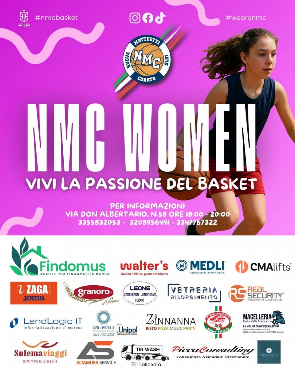 E per realizzare questo sogno chiamato NMC WOMEN, unico nella città di Corato, la NMC ha bisogno di giovani atlete pronte a mettersi in gioco e ad innamorarsi del meraviglioso mondo della palla a spicchi. Per ricevere informazioni su come entrare a far parte dei gruppi u13 e u14 femminile, vieni a trovarci nella sede di via don Albertario n. 58 oppure contatta il seguente recapito telefonico:
